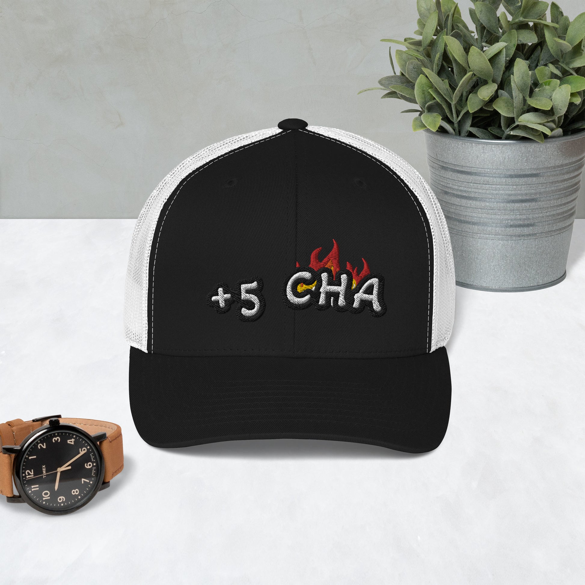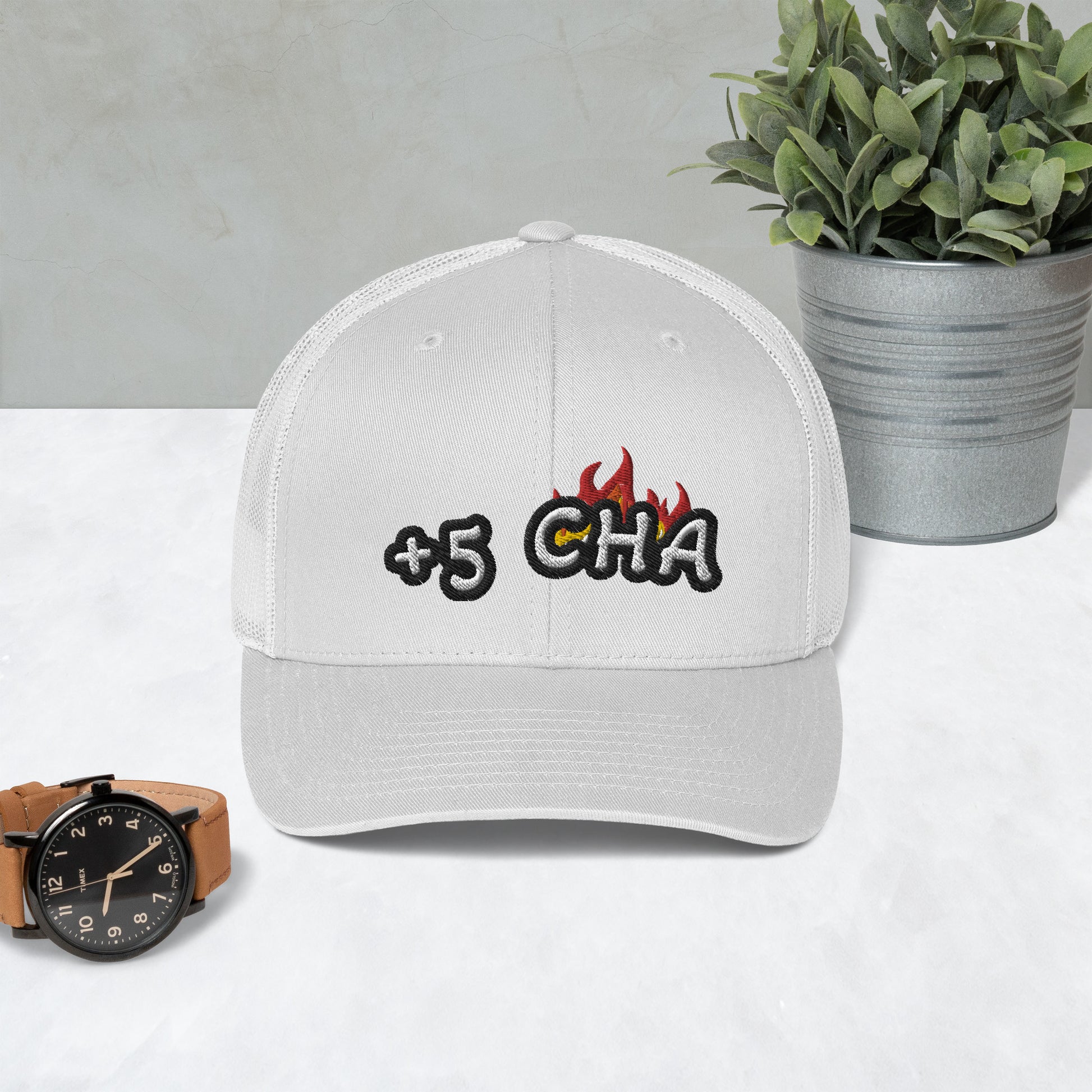 Level up your style and show off your charisma with our "+5 CHA" Trucker Cap. This classic six-panel cap with a mesh back is the perfect choice for a sunny day, combining comfort, versatility, and a touch of gaming flair.